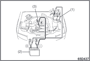 - Se a bateria auxiliar usada para a partida de emergência estiver instalada em outro veículo, dê partida no motor do veículo usando a bateria auxiliar. Deixe o motor em rotação moderada.